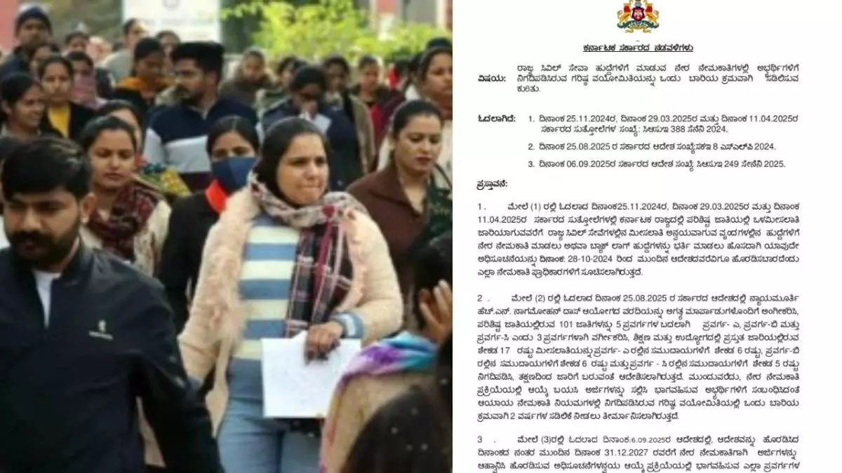 ಈ ಆದೇಶ ಹೊರಡಿಸಿದ ದಿನಾಂಕದ 2027 ಡಿ.31 ರವರೆಗೆ ನೇರ ನೇಮಕಾತಿಗಾಗಿ ಅರ್ಜಿಗಳನ್ನು ಆಹ್ವಾನಿಸಿ ಹೊರಡಿಸುವ ಅಧಿಸೂಚನೆಗಳನ್ವಯ ಆಯ್ಕೆ ಪ್ರಕ್ರಿಯೆಯಲ್ಲಿ ಭಾಗವಹಿಸುವ ಎಲ್ಲಾ ಪ್ರವರ್ಗಗಳ ಅಭ್ಯರ್ಥಿಗಳಿಗೆ ಸಂಬಂಧಿಸಿದಂತೆ ಆಯಾಯ ನೇಮಕಾತಿ ನಿಯಮಗಳಲ್ಲಿ ನಿಗದಿಪಡಿಸಿರುವ ಗರಿಷ್ಠ ವಯೋಮಿತಿಯಲ್ಲಿ ಒಂದು ಬಾರಿಯ ಕ್ರಮವಾಗಿ ಮೂರು ವರ್ಷಗಳ ಸಡಿಲಿಕೆ ನೀಡಿ ಸಿಬ್ಬಂದಿ ಮತ್ತು ಆಡಳಿತ ಸುಧಾರಣಾ ಇಲಾಖೆ ಸರ್ಕಾರದ ವಿಶೇಷ ಕಾರ್ಯದರ್ಶಿ ಆದೇಶ ಹೊರಡಿಸಿ ಆದೇಶಿಸಿದ್ದಾರೆ.