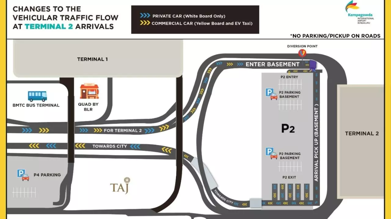 ಹಳದಿ ಬೋರ್ಡ್ ಇರುವ ಟ್ಯಾಕ್ಸಿಗಳು ಮತ್ತು ಎಲೆಕ್ಟ್ರಿಕ್ ಕ್ಯಾಬ್ಗಳು ಪ್ರಯಾಣಿಕರಿಗಾಗಿ ನೇರವಾಗಿ ಆಗಮನ ದ್ವಾರದ ಮುಂದೆ ಕಾಯುವಂತಿಲ್ಲ. ನಿಗದಿಪಡಿಸಿದ ಪಾರ್ಕಿಂಗ್ ವಲಯಗಳಲ್ಲೇ ಇರಬೇಕು. ಟರ್ಮಿನಲ್ 1 ಕ್ಕೆ ಬರುವ ಟ್ಯಾಕ್ಸಿಗಳು ಪಿ3 ಮತ್ತು ಪಿ4 ಪಾರ್ಕಿಂಗ್ ಬಳಸಬೇಕು. ಟರ್ಮಿನಲ್ 2ಗೆ ಬರುವ ಟ್ಯಾಕ್ಸಿಗಳು ಪಿ2 ಪಾರ್ಕಿಂಗ್ ಬಳಸಬೇಕು. ಸುಗಮ ಪಿಕ್-ಅಪ್ಗಾಗಿ ಪಾರ್ಕಿಂಗ್ಗೆ ಬಂದ ಮೊದಲ 10 ನಿಮಿಷ ಉಚಿತವಾಗಿರುತ್ತದೆ.