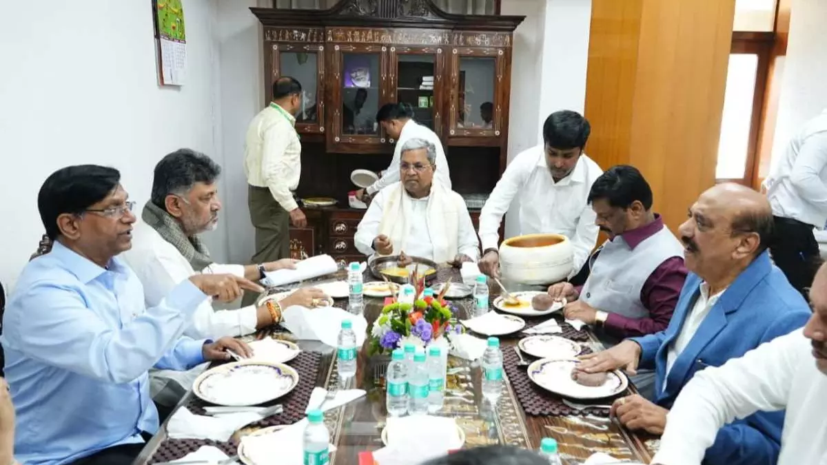 ನವದೆಹಲಿಯ ಕರ್ನಾಟಕ ಭವನದಲ್ಲಿ ಸಿಎಂ ಸಿದ್ದರಾಮಯ್ಯ ಸೇರಿದಂತೆ ಸಚಿವರು ಹಾಗೂ ಶಾಸಕರು ಭೋಜನ ಸೇವಿಸಿದರು.