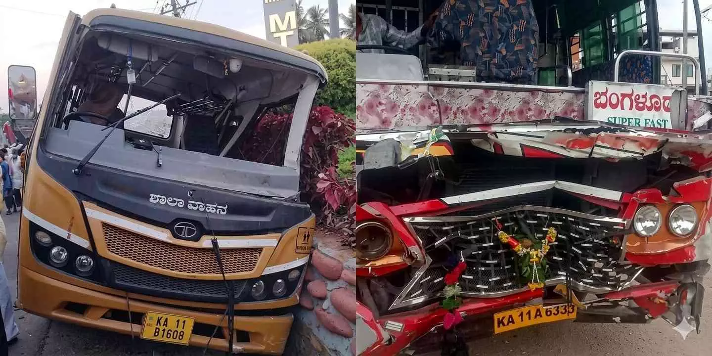 ಮಂಡ್ಯದಲ್ಲಿ ಶಾಲಾ ವಾಹನಕ್ಕೆ ಖಾಸಗಿ ಬಸ್ ಮುಖಾಮುಖಿ ಡಿಕ್ಕಿ, 11ಕ್ಕೂ ಹೆಚ್ಚು ಮಕ್ಕಳಿಗೆ ಗಾಯ, ಇಬ್ಬರ ಸ್ಥಿತಿ ಗಂಭೀರ
