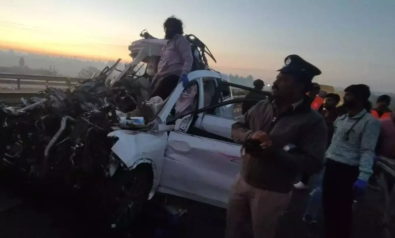 ಹೊಸಕೋಟೆ ಬಳಿ ಸಂಭವಿಸಿದ ಭೀಕರ ಅಪಘಾತದಲ್ಲಿ ಸಂಪೂರ್ಣ ಜಖಂಗೊಂಡಿರುವ ಕಾರು