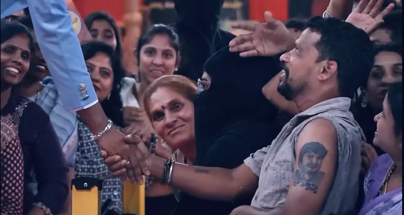 ಬಿಗ್ ಬಾಸ್ ಮನೆಯ ವಿಶೇಷ ಸಂದರ್ಭದಲ್ಲಿ ಅಭಿಮಾನಿಗಳನ್ನು ಭೇಟಿ ಮಾಡುವ ಅವಕಾಶ ಸಿಕ್ಕಾಗ, ಮಂಡ್ಯದ ಈ ಅಭಿಮಾನಿ ತನ್ನ ಟ್ಯಾಟೂವನ್ನು ತೋರಿಸಿದ್ದಾರೆ.