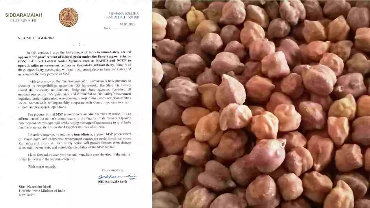 ಧಾರವಾಡ, ವಿಜಯಪುರ ಸೇರಿದಂತೆ ಉತ್ತರ ಕರ್ನಾಟಕದ ಹಲವು ಜಿಲ್ಲೆಗಳಲ್ಲಿ ಸುಮಾರು 6.27 ಲಕ್ಷ ಹೆಕ್ಟೇರ್ ಪ್ರದೇಶದಲ್ಲಿ ಕಡಲೆ ಬೆಳೆಯಲಾಗಿದೆ. ವರ್ಷವಿಡೀ ಕಷ್ಟಪಟ್ಟು ಬೆಳೆದ ಬೆಳೆಗೆ ಸರಿಯಾದ ಬೆಲೆ ಸಿಗದೆ ರೈತರು ಕಂಗಾಲಾಗಿದ್ದಾರೆ. ಮಾರುಕಟ್ಟೆಯಲ್ಲಿ ಬೆಲೆ ಕುಸಿತವನ್ನು ತಡೆಯಲು 'ಬೆಲೆ ಬೆಂಬಲ ಯೋಜನೆ' (PSS) ಅಡಿಯಲ್ಲಿ ನಾಫೆಡ್ (NAFED) ಮತ್ತು ಎನ್ಸಿಸಿಎಫ್ (NCCF) ಮೂಲಕ ಕೂಡಲೇ ಖರೀದಿ ಪ್ರಕ್ರಿಯೆ ಆರಂಭಿಸಬೇಕು ಎಂದು ರಾಜ್ಯ ಸರ್ಕಾರ ಕೇಂದ್ರವನ್ನು ಆಗ್ರಹಿಸಿದೆ. ಖರೀದಿ ಪ್ರಕ್ರಿಯೆಗೆ ಅಗತ್ಯವಾದ ಅಧಿಸೂಚನೆ ಮತ್ತು ಲಾಜಿಸ್ಟಿಕ್ಸ್ ವಿನಾಯಿತಿಗಳನ್ನು ನೀಡಲು ರಾಜ್ಯ ಸಿದ್ಧವಿದೆ ಎಂದು ಸಿಎಂ ಸ್ಪಷ್ಟಪಡಿಸಿದ್ದಾರೆ.