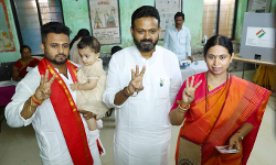 ಬೆಳಗಾವಿ: ತಾಲ್ಲೂಕಿನ ಹಿಂಡಲಗಾದ ವಿಜಯನಗರದ ಸರ್ಕಾರಿ ಮರಾಠಿ ಶಾಲೆ ಮತಗಟ್ಟೆಯಲ್ಲಿ ಮಹಿಳಾ ಮತ್ತು ಮಕ್ಕಳ ಅಭಿವೃದ್ಧಿ ಸಚಿವೆ ಲಕ್ಷ್ಮಿ ಹೆಬ್ಬಾಳಕರ, ವಿಧಾನ ಪರಿಷತ್ ಸದಸ್ಯ ಚನ್ನರಾಜ ಹಟ್ಟಿಹೊಳಿ, ಕಾಂಗ್ರೆಸ್ ಅಭ್ಯರ್ಥಿ ಮೃಣಾಲ್ ಹೆಬ್ಬಾಳಕರ ಮತ ಚಲಾಯಿಸಿದರು. ಮತ ಚಲಾಯಿಸಿ ಹೊರಬಂದು ವಿಜಯದ ಸಂಕೇತ ತೋರಿದರು.