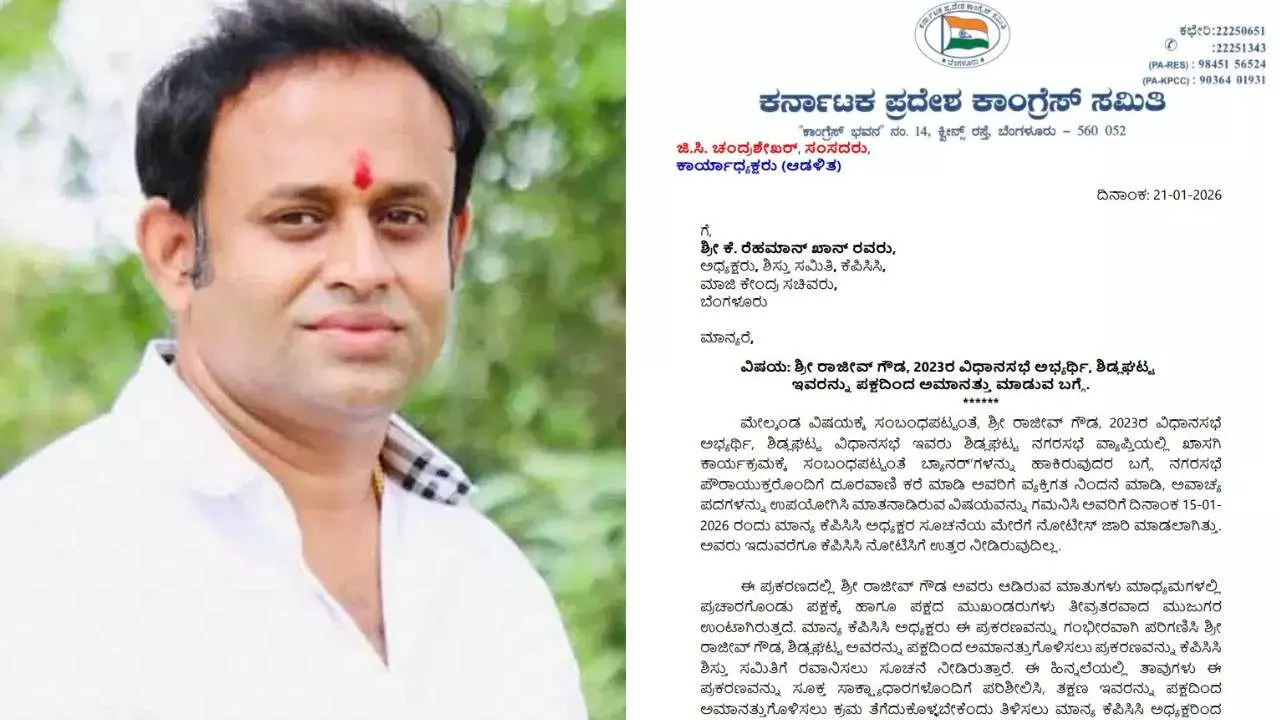 ಡ್ಯಾಮೇಜ್ ಕಂಟ್ರೋಲ್ಗೆ ಮುಂದಾಗಿರುವ ಕೆಪಿಸಿಸಿ, ರಾಜೀವ್ ಗೌಡ ವಿರುದ್ಧ ಶಿಸ್ತು ಕ್ರಮಕ್ಕೆ ಮುಂದಾಗಿದೆ. ಕೆಪಿಸಿಸಿ ಕಾರ್ಯಾಧ್ಯಕ್ಷ ಜಿ.ಸಿ. ಚಂದ್ರಶೇಖರ್ ಅವರು, ರಾಜೀವ್ ಗೌಡ ಅವರನ್ನು ಪಕ್ಷದಿಂದ ಅಮಾನತುಗೊಳಿಸುವಂತೆ ಶಿಸ್ತು ಸಮಿತಿ ಅಧ್ಯಕ್ಷ ರೆಹಮಾನ್ ಖಾನ್ ಅವರಿಗೆ ಅಧಿಕೃತವಾಗಿ ಶಿಫಾರಸು ಮಾಡಿದ್ದಾರೆ.