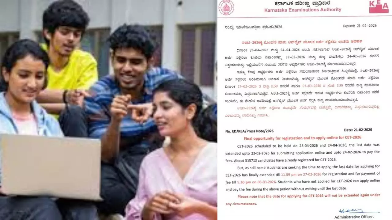 ಇದು ಸಿಇಟಿ-2026 (KCET 2026) ಪರೀಕ್ಷೆಗೆ ಅರ್ಜಿ ಸಲ್ಲಿಸಲು ನೀಡಲಾಗುತ್ತಿರುವ ಅಂತಿಮ ಅವಕಾಶವಾಗಿದೆ. ಫೆಬ್ರವರಿ 27ರ ನಂತರ ಯಾವುದೇ ಕಾರಣಕ್ಕೂ ಮತ್ತೆ ದಿನಾಂಕವನ್ನು ವಿಸ್ತರಿಸುವುದಿಲ್ಲ ಎಂದು ಕೆಇಎ ಸ್ಪಷ್ಟಪಡಿಸಿದೆ.