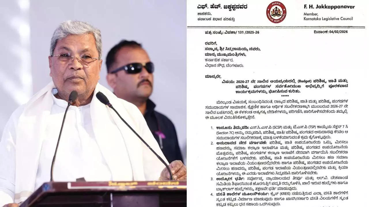 ಸೋಮವಾರ(ಫೆ.9) ಪತ್ರ ಬರೆದಿರುವ ಅವರು, 2026-27 ನೇ ಸಾಲಿನ ಬಜೆಟ್ನಲ್ಲಿ ಪರಿಶಿಷ್ಟ ಜಾತಿ ಮತ್ತು ಪರಿಶಿಷ್ಟ ಪಂಗಡಗಳ ಸರ್ವತೋಮುಖ ಅಭಿವೃದ್ಧಿಗೆ ಪೂರಕವಾದ ಕಾರ್ಯಕ್ರಮಗಳನ್ನು ಘೋಷಿಸಬೇಕು. ಹಣವನ್ನು ಸಮಾಜ ಕಲ್ಯಾಣ ಇಲಾಖೆಗೂ ಮತ್ತು ಪರಿಶಿಷ್ಟ ಪಂಗಡದ ಉಪಯೋಜನೆಯ ಮೊತ್ತವನ್ನು ಪರಿಶಿಷ್ಟ ಪಂಗಡಗಳ ಕಲ್ಯಾಣ ಇಲಾಖೆಗೆ ನೇರವಾಗಿ ವರ್ಗಾಯಿಸಿ ಸಬಲೀಕರಣ ಯೋಜನೆಗಳಿಗೆ ಬಳಸಬೇಕು. ಪರಿಶಿಷ್ಟ ಜಾತಿ ಉಪಯೋಜನೆಯ ಮೀಸಲು ಹಣ ಸಮಾಜ ಕಲ್ಯಾಣ ಇಲಾಖೆಯ ನಿಯಂತ್ರಣದಲ್ಲಿರಬೇಕು ಹಾಗೂ ಪರಿಶಿಷ್ಟ ಪಂಗಡದ ಉಪಯೋಜನೆಯ ಮೀಸಲು ಹಣವನ್ನು ಪರಿಶಿಷ್ಟ ಪಂಗಡ ಇಲಾಖೆಯ ನಿಯಂತ್ರಣದಲ್ಲಿರಬೇಕು ಮತ್ತು ಕ್ರಿಯಾ ಯೋಜನೆಗಳನ್ನು ಈ ಎರಡು ಇಲಾಖೆಗಳು ಸಿದ್ಧಪಡಿಸಿ ಜಾರಿಗೊಳಿಸಬೇಕು ಎಂದಿದ್ದಾರೆ.
