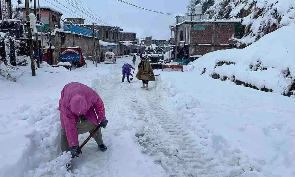ಜಮ್ಮು ಮತ್ತು ಕಾಶ್ಮೀರದ ರಾಜೌರಿ ಜಿಲ್ಲೆಯಲ್ಲಿ ಭಾನುವಾರ ಭಾರೀ ಹಿಮಪಾತದ ನಂತರ ಕಾರ್ಮಿಕರು ಅಡಚಣೆಯಾದ ರಸ್ತೆಯನ್ನು ತೆರವುಗೊಳಿಸಿದರು.