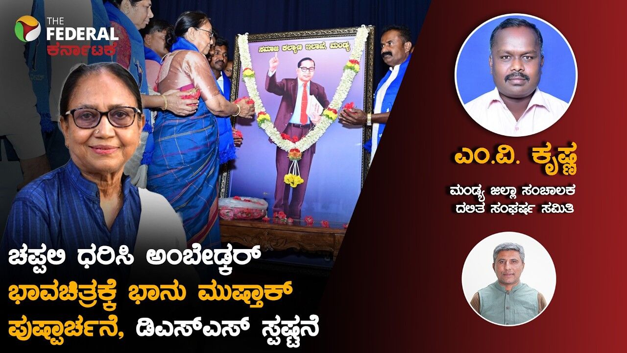 ಮಂಡ್ಯದಲ್ಲಿ ದಲಿತ ಸಂಘರ್ಷ ಸಮಿತಿ ಹಾಗೂ ಶ್ರೀನಿವಾಸ್ ಫೌಂಡೇಶನ್ ವತಿಯಿಂದ ಆಯೋಜಿಸಲಾಗಿದ್ದ 'ಸಂವಿಧಾನ ಉಳಿವಿಗಾಗಿ ಜನಜಾಗೃತಿ' ಕಾರ್ಯಕ್ರಮವೊಂದರಲ್ಲಿ ನಡೆದ ಘಟನೆ ಇದೀಗ ಸಾಮಾಜಿಕ ಜಾಲತಾಣಗಳಲ್ಲಿ ಭಾರೀ ಚರ್ಚೆಗೆ ಕಾರಣವಾಗಿದೆ. ಈ ಕಾರ್ಯಕ್ರಮದಲ್ಲಿ ಖ್ಯಾತ ಲೇಖಕಿ ಹಾಗೂ ಬೂಕರ್ ಪ್ರಶಸ್ತಿ ಪುರಸ್ಕೃತರಾದ ಬಾನು ಮುಷ್ತಾಕ್ ಅವರು ಪಾದರಕ್ಷೆ ಧರಿಸಿಯೇ ಡಾ. ಬಿ.ಆರ್. ಅಂಬೇಡ್ಕರ್ ಅವರ ಭಾವಚಿತ್ರಕ್ಕೆ ಪುಷ್ಪಾರ್ಚನೆ ಮಾಡಿದ್ದಾರೆ ಎಂಬ ಆರೋಪ ಕೇಳಿಬಂದಿದೆ. ಈ ವಿವಾದದ ಬೆನ್ನಲ್ಲೇ, ಕಾರ್ಯಕ್ರಮದ ಸಂಘಟಕರಲ್ಲೊಬ್ಬರಾದ ಎಂ.ವಿ. ಕೃಷ್ಣ ಅವರು 'ದ ಫೆಡರಲ್ ಕರ್ನಾಟಕ'ಕ್ಕೆ ನೀಡಿದ ವಿಶೇಷ ಸಂದರ್ಶನದಲ್ಲಿ ಅಂದು ನಡೆದ ಘಟನೆಯ ಬಗ್ಗೆ ಸವಿಸ್ತಾರವಾಗಿ ವಿವರಿಸಿದ್ದಾರೆ. ಅಂಬೇಡ್ಕರ್ ಅವರಿಗೆ ಅವಮಾನ ಮಾಡುವ ಉದ್ದೇಶ ಅಲ್ಲಿ ಇತ್ತೇ? ಅಥವಾ ತಾಂತ್ರಿಕವಾಗಿ ಅಲ್ಲಿ ಏನಾಗಿತ್ತು? ಎಂಬುದರ ಕುರಿತು ಸಂಘಟಕರು ನೀಡಿರುವ ಸ್ಪಷ್ಟನೆ ಈ ವೀಡಿಯೊದಲ್ಲಿದೆ.