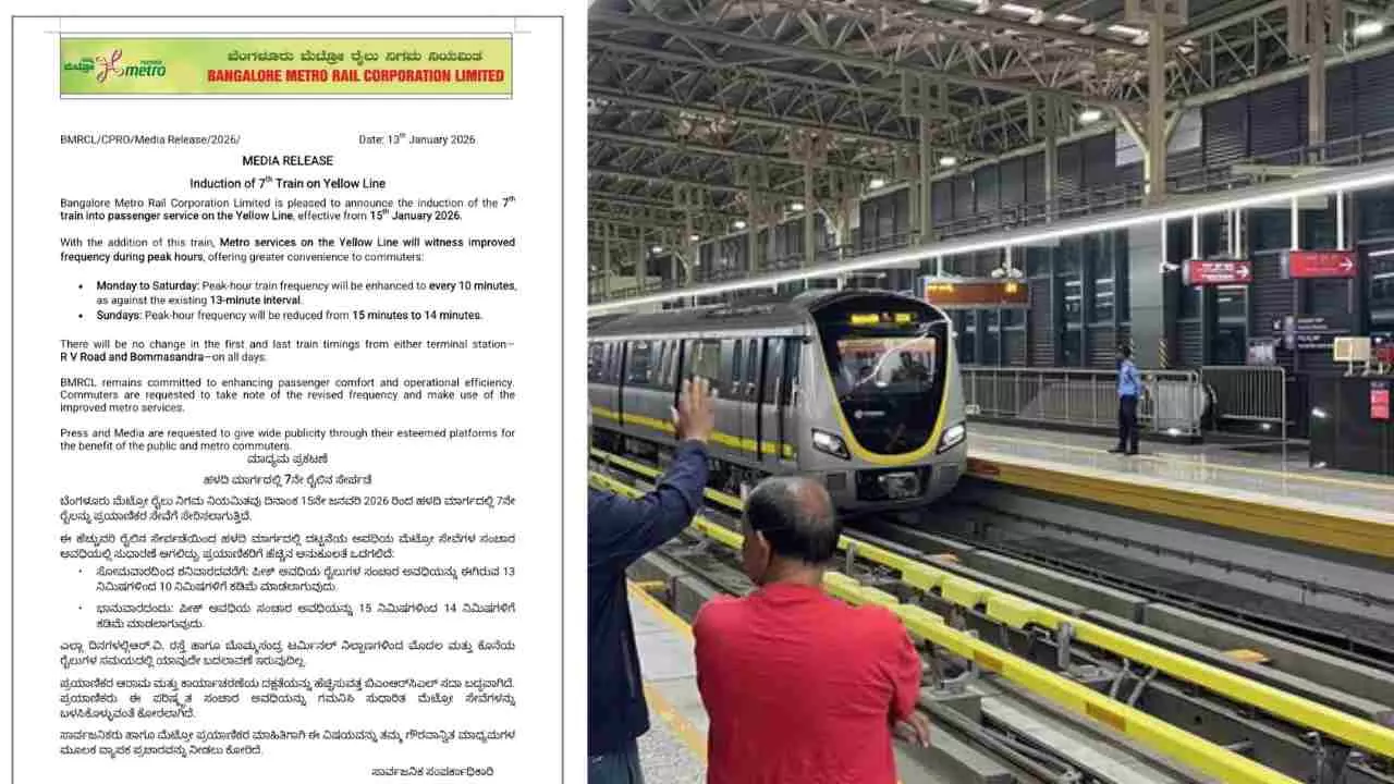 ಸಿಲಿಕಾನ್ ಸಿಟಿಯ ಆರ್ವಿ ರಸ್ತೆ ಮತ್ತು ಬೊಮ್ಮಸಂದ್ರ ನಡುವಿನ ಹಳದಿ ಮಾರ್ಗದಲ್ಲಿ ಪ್ರಯಾಣಿಸುವ ಮೆಟ್ರೋ ಪ್ರಯಾಣಿಕರಿಗೆ ಬೆಂಗಳೂರು ಮೆಟ್ರೋ ರೈಲು ನಿಗಮವು ಸಂಕ್ರಾಂತಿಯ ಸಿಹಿ ಸುದ್ದಿ ನೀಡಿದೆ. 19 ಕಿಲೋಮೀಟರ್ ಉದ್ದದ ಈ ಮಾರ್ಗದಲ್ಲಿ ದಿನದಿಂದ ದಿನಕ್ಕೆ ಹೆಚ್ಚಾಗುತ್ತಿರುವ ಪ್ರಯಾಣಿಕರ ಒತ್ತಡವನ್ನು ನಿಭಾಯಿಸಲು, ಬರುವ ಜನವರಿ 15ರಿಂದ ಏಳನೇ ರೈಲನ್ನು ಸಂಚಾರಕ್ಕೆ ಮುಕ್ತಗೊಳಿಸುವುದಾಗಿ ನಿಗಮ ಅಧಿಕೃತವಾಗಿ ಘೋಷಿಸಿದೆ. 2025ರಲ್ಲಿ ಈ ಮಾರ್ಗ ಉದ್ಘಾಟನೆಯಾದಾಗಿನಿಂದ ಐಟಿ ಉದ್ಯೋಗಿಗಳು ಸೇರಿದಂತೆ ನಿತ್ಯ ಪ್ರಯಾಣಿಕರ ಸಂಖ್ಯೆ ಗಣನೀಯವಾಗಿ ಏರಿಕೆಯಾಗಿದ್ದು, ಈ ಹಿನ್ನೆಲೆಯಲ್ಲಿ ಸುಗಮ ಸಂಚಾರಕ್ಕಾಗಿ ಹೆಚ್ಚುವರಿ ರೈಲನ್ನು ನಿಯೋಜಿಸಲಾಗುತ್ತಿದೆ.